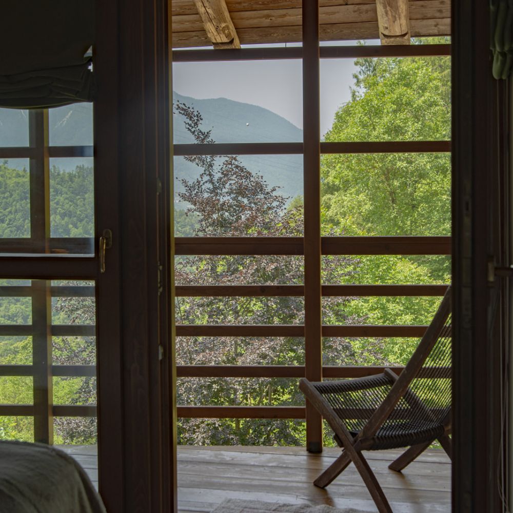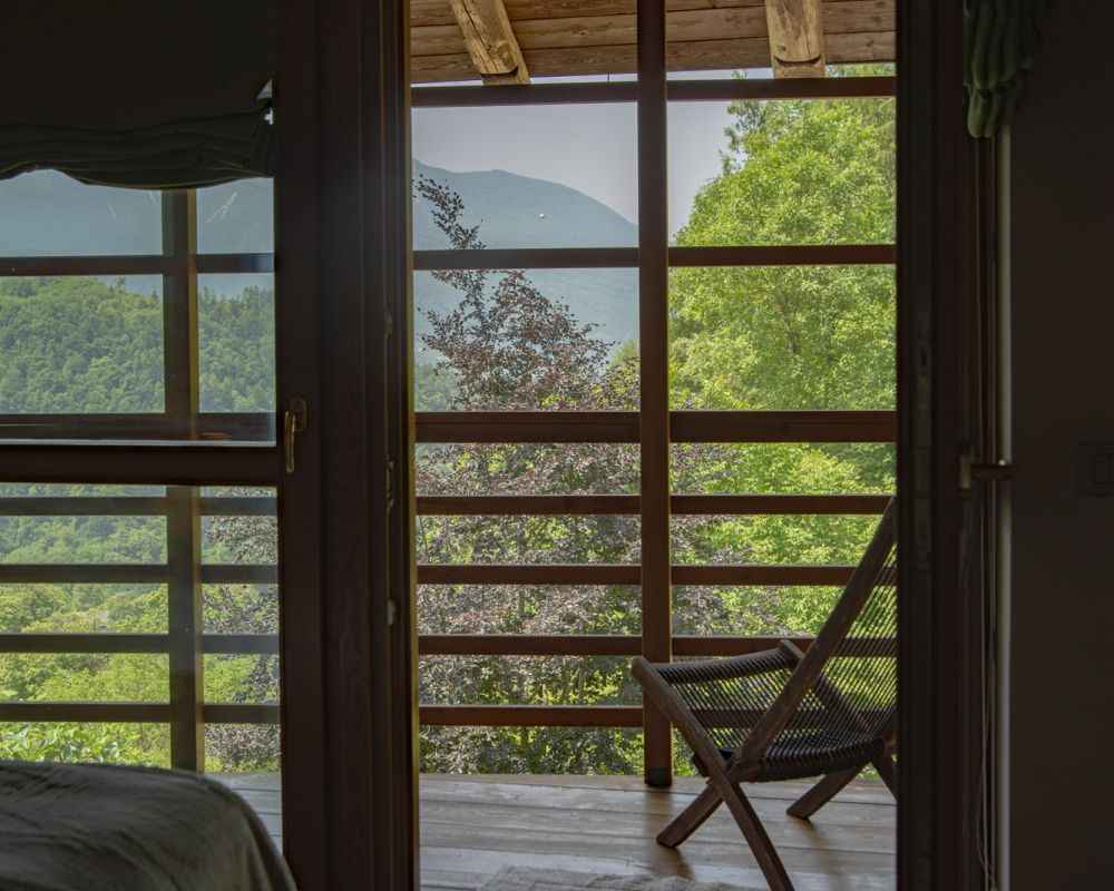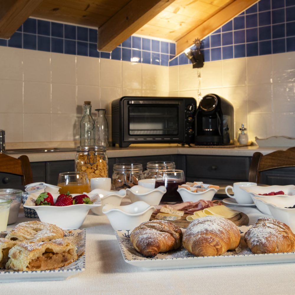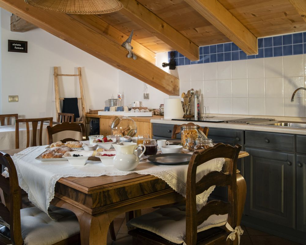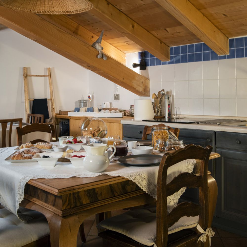 Dal terrazzino in legno potrai ammirare boschi e montagne, rilassarti sotto il sole o leggere in assoluta tranquillità . La cucina ti accoglie con profumi di dolci fatti in casa e colazioni genuine, per iniziare la giornata con energia e serenitÃ